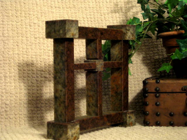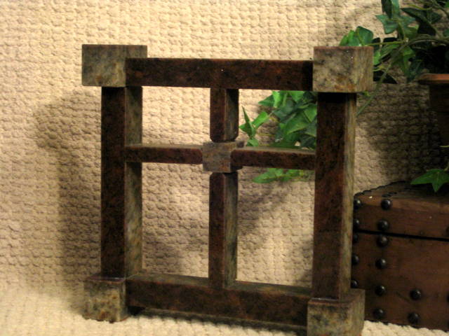 8 inches by 8 inches. This standing granite cross for tabletop use is our newest hollow style. The brown granite cross sits inside the middle of a square frame. The granite is a beautiful multi-hued brown, with rusty areas and small black flecks. The corners have rectangular blocks for accent. There is a square in the center as well in the accent color. Typically, when the granite is highlighted with color enhancer on the cut edges, the color is the same as the finished face. In this case the cut edges are lighter since they did not darken or intensify. My original intent was to make this cross all one color but I like this much more! The color difference adds to the character of the piece and we will make many more intentionally now that have blocks and center squares in an accent color. This will be the only square hollow though, that will have the different inside and outside edge colors.