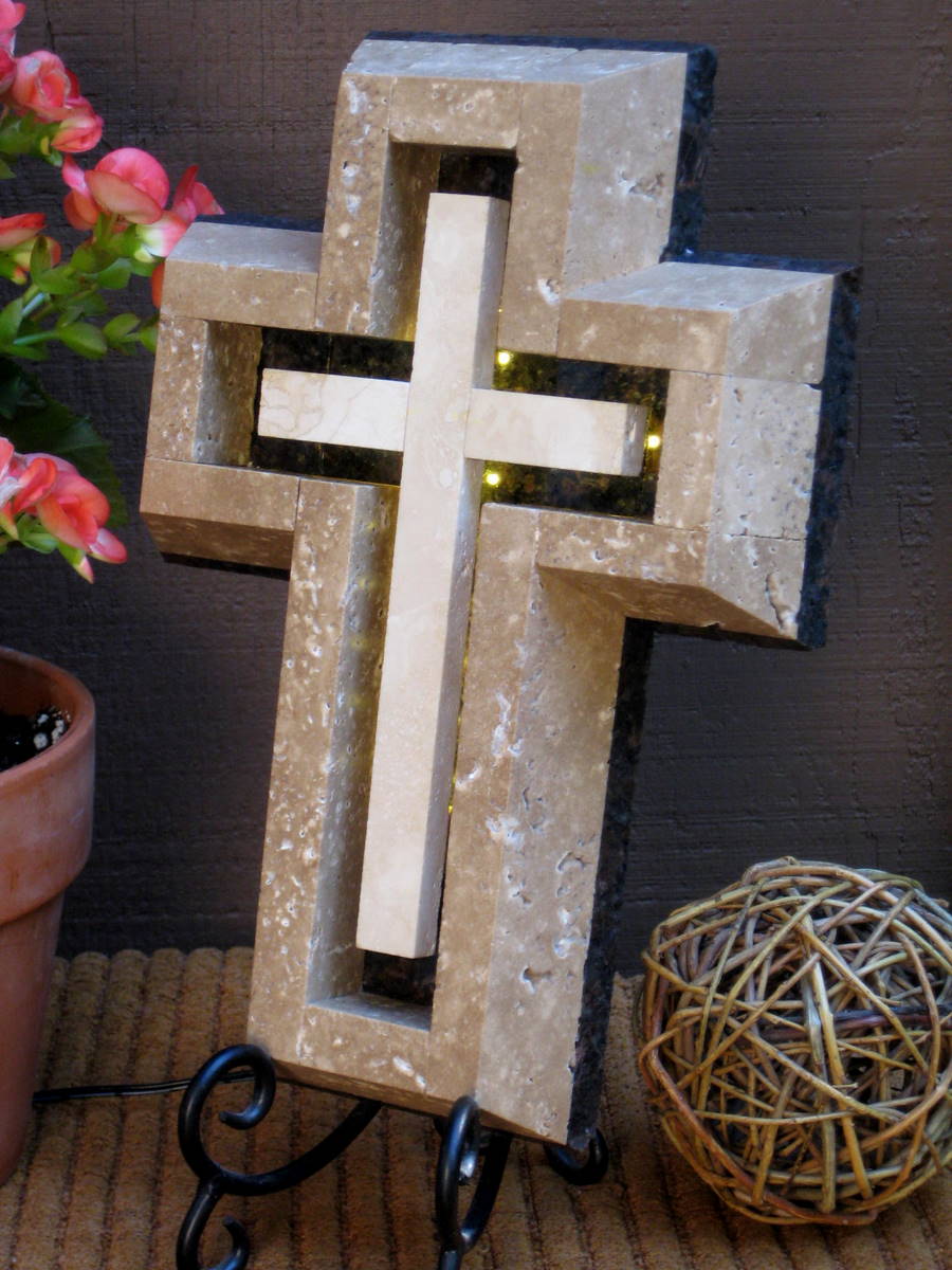 Floating Backlit Cross Plaque - Brown Granite and Travertine