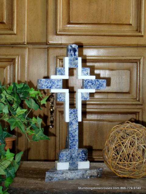 12 inches. This standing blue marble cross for tabletop use is designed with a hollow center to form a cross within a cross! Accented with white marble peices. The speckled blue cross has broken edges and a broken base for added character. Indoor use only.