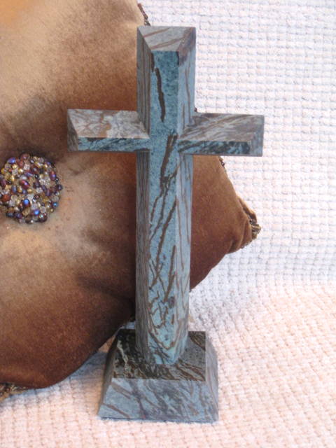 11 inches. This standing cross for tabletop is quite unique. The soapstone is a subtle blue green color that has coppery veins running through it that remind me of the crown of thorns that Jesus wore on his head at the crucifixion. This cross has more of a slightly faded look.