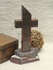 10 3/4 inches. This gorgeous standing granite cross for tabletop use has a stunning mix of colors! The interior granite has horizontal layering of grays, browns and rusty red. The outer portion accents the cross in a subtle rusty red that has flecks of grays and black in it. The colors are gorgeous together and blend beautifully! The base of the cross is a Lake Superior Stone. The rock was shaped so that the cross sits inside or into the rock. The base is gray with red in it as well. A perfect compliment.