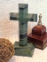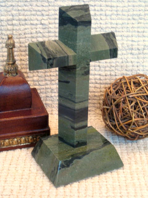 8.5 inches. This cool standing granite cross will make a great gift for hunters or those in the military! Light and dark cool greens have been deposited in layers in this stone.