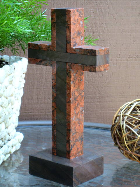 9 3/4 inches. This gorgeous standing granite cross for tabletop use has a stunning mix of colors! The interior granite has a horizontal layering of grays, browns and rusty red. The outer portion accents the cross in a rusty red that has light and dark grays in it, with flecks of black. The colors are gorgeous together!