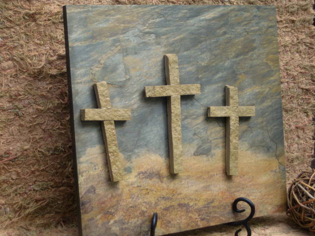 13 1/2 wide by 12 1/2 inches tall. We searched for a pieces of slate that had a nature scene in it and we were fortunate enough to have found these! The golden brown hills may have looked just like this on the day Jesus was crucified. The crosses are limestone. This wall plaque can be displayed with a plate holder as well, as shown.