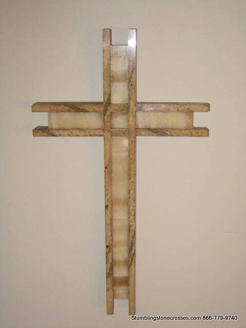 16 inches. This wall cross is gorgeous! Each piece of multihued onyx is surrounded by beautiful golden brown Jupinera granite. The granite and the onyx are at differing depths for an interesting dimensional look which adds to the style of this cross. Our crosses are individually handcrafted. Although this material has the same colors in each cross, the patterns of the colorations in each cross may vary. The main picture more accurately reflects the true colors.