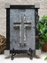 12 inch height. This wall plaque with a cross is made from black granite, with the background being an iridescent multi-hued gray quartzite. The gray composite corners are in the form of a cube which extend beyond the frame in all directions. We have added an interesting 4 piece granite cross design in the center which has a subtle green hue to it. The cool colors will go well with any sleek decor. The plaque can be displayed as a plate, used with a plate holder as shown.